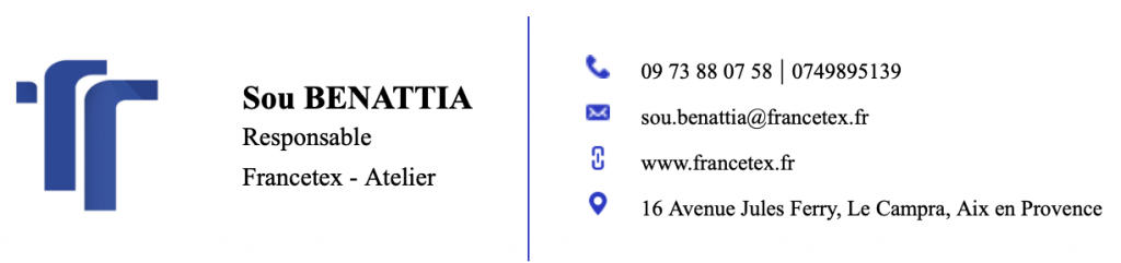 Créée et basée à Aix-en-Provence depuis 10 ans, FRANCETEX est une entreprise locale spécialisée dans le textile personnalisé (t-shirts, sweats, tote bags, polos…). Nous accompagnons associations, clubs, écoles et entreprises dans la création de leurs vêtements et accessoires, avec des impressions et broderies de qualité professionnelle.